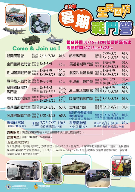 113年國軍暑期戰鬥營於6/15中午12時開放網路報名,歡迎報名參加。